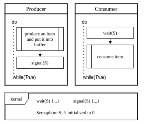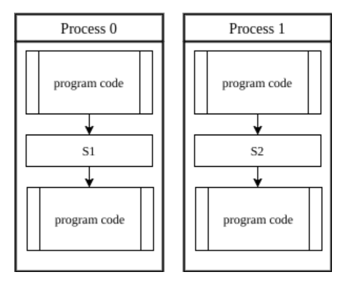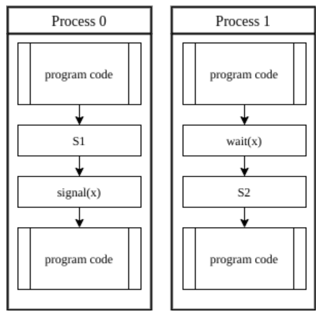 假设我们S1之前S2要执行代码片段。换句话说,我们希望Process 1在执行S2之前等待,直到Process 0 完成执行S1: