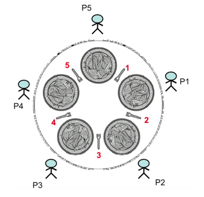 我们有五个哲学家围坐在一张桌子旁,拿着五根筷子。每当哲学家想吃饭时,它需要两根筷子。在这个问题中,筷子是我们想要在进程之间同步的资源。