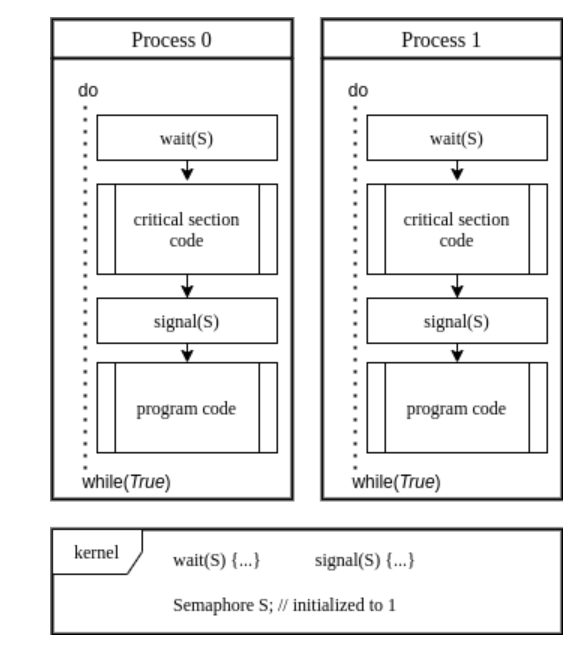 临界区是程序代码的一部分,我们希望避免并发访问。我们可以使用二进制信号量来解决临界区部分问题。在这种情况下,信号量的初始值在内核中为 1: