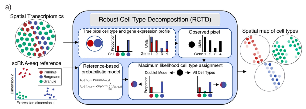 RCTD(Robust Cell Type Decomposition),是一种用于将单细胞RNA测序数据中的细胞类型注释转移到空间转录组学数据上的方法,于2021年2月18号发表在Nature Biotechnology杂志上,标题为《Robust decomposition of cell type mixtures in spatial transcriptomics》。RCTD 通过整合单细胞和空间转录组学数据,能够较为精确地为空间 spots 分配细胞类型,以便更好地理解空间组织结构中的基因表达情况。