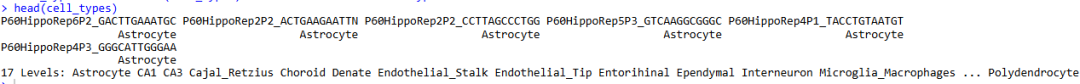 ..@ cell_types: Factor w/ 17 levels "Astrocyte","CA1",..: 1111111111...