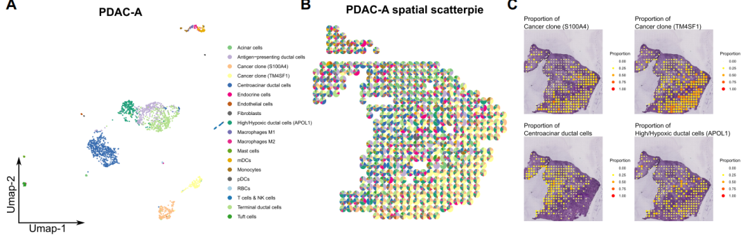 这个反卷积结果可以看到,某些区域细胞类型占比比较大,具有区域特征。绘图的时候还有个小技巧:同种类型的细胞的不同亚型,可以设置同种色系,可以方便更清晰的看出来区域特征。这里就不展示了,毕竟还要去找色系来对应。
