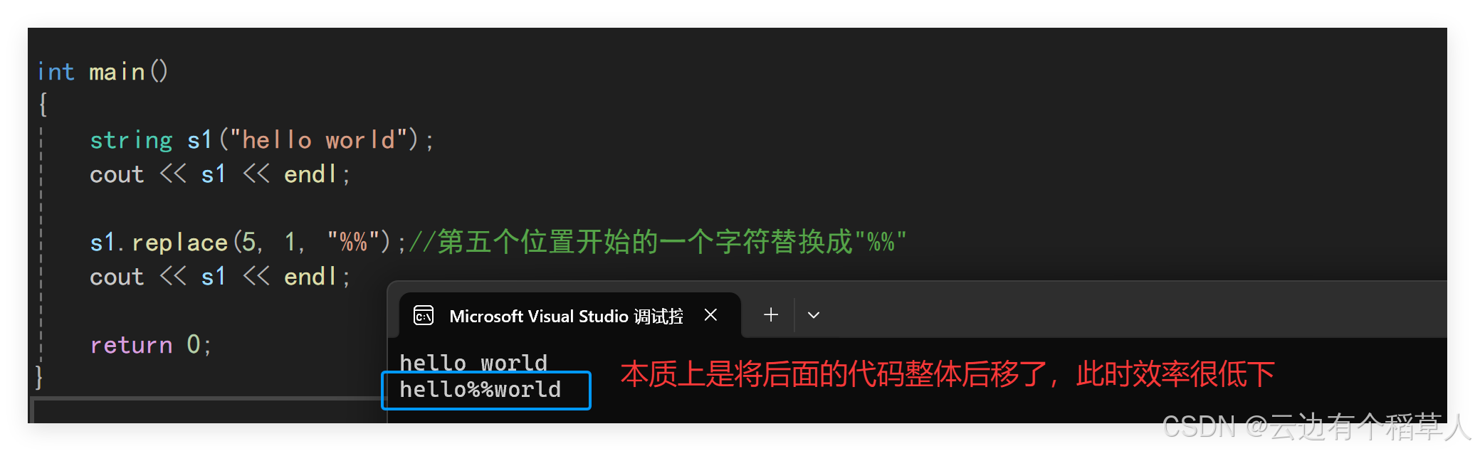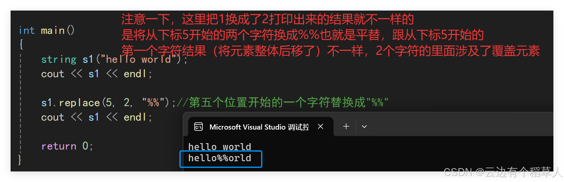 s1.replace(5, 2, "%%");//第五个位置开始的一个字符替换成"%%"