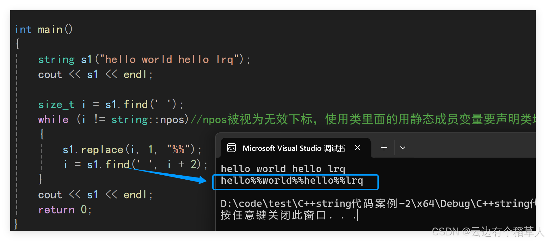 while (i != string::npos)//npos被视为无效下标,使用类里面的用静态成员变量要声明类域