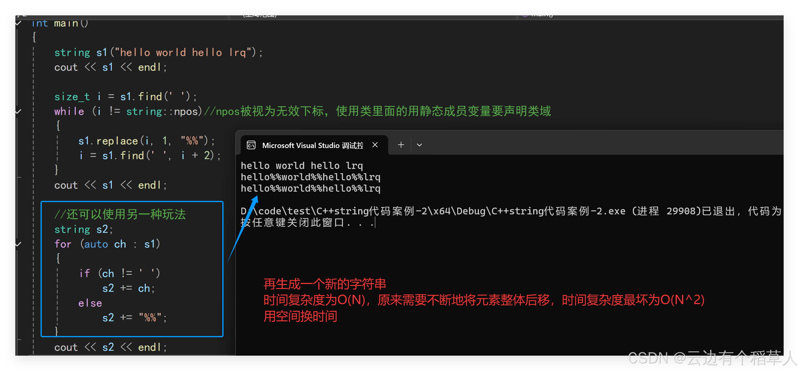 }这让我们想起来以前有个将字符串里面的空格替换成别的字符的问题,我们再来看一下用现在学的知识如何来解决