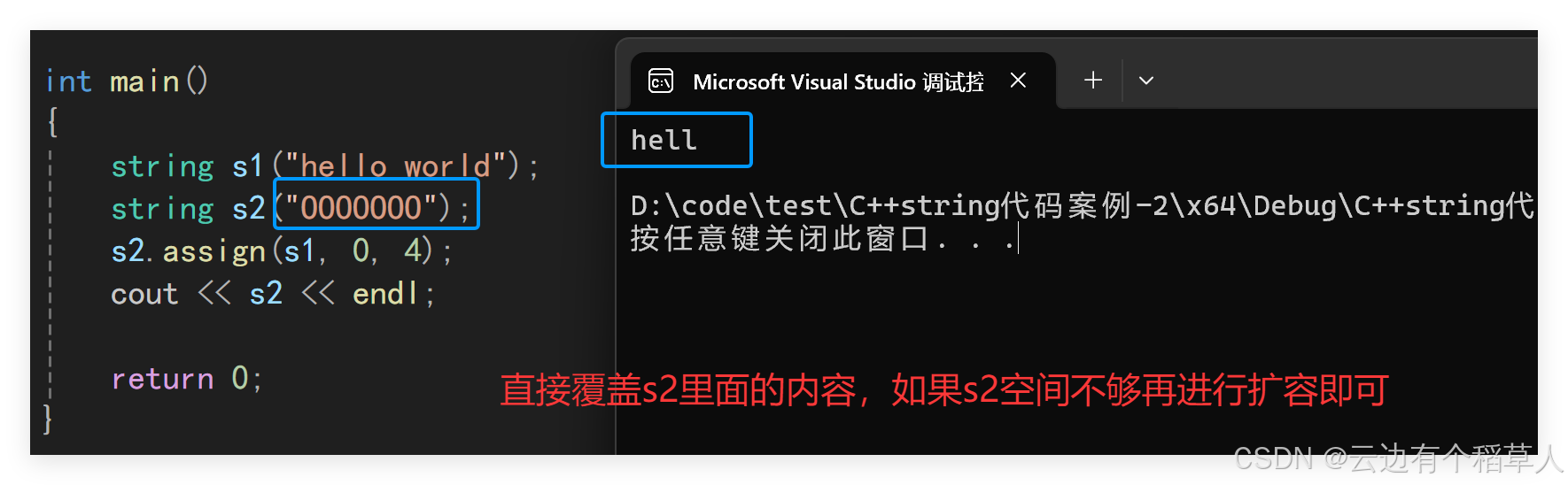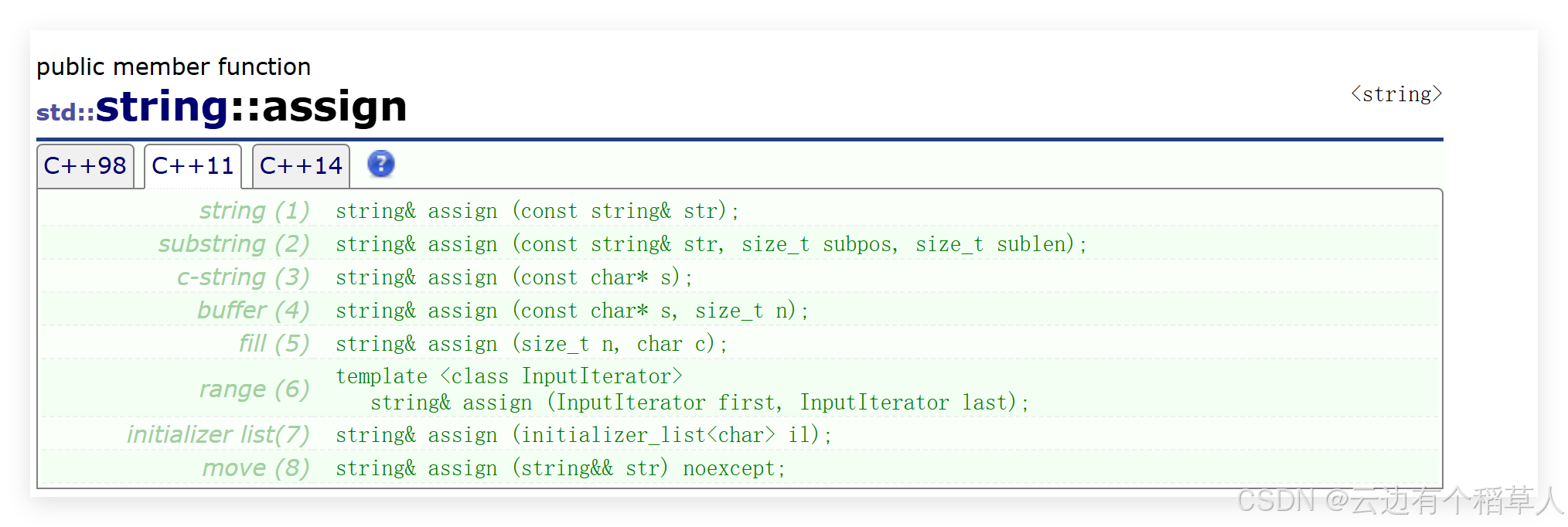 assign在功能上是一种赋值,operator=比assign要简单一点,operator=是将对象赋值给另外一个对象,进行对象之间的拷贝,assign支持的更复杂一点,见下:(该接口了解即可,使用的时候查看文档)