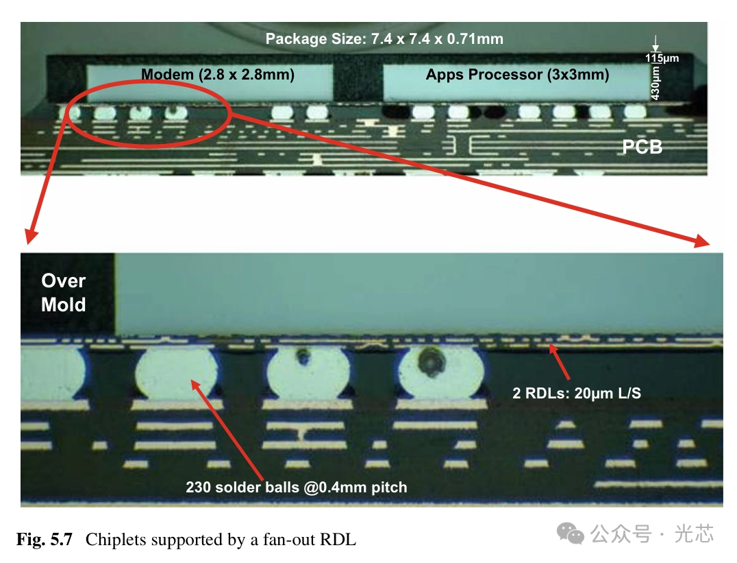 图5.7展示了2013年推出的HTC(Desire 606 W)智能手机中的应用处理器芯片组。应用处理器芯片组是SPREADTRUM SC8502,这是通过扇出芯片优先chip-first工艺异构集成的modem和应用处理器。这些芯片由扇出2层重分布层(RDLs)基板支持,然后在印刷电路板(PCB)上焊接。