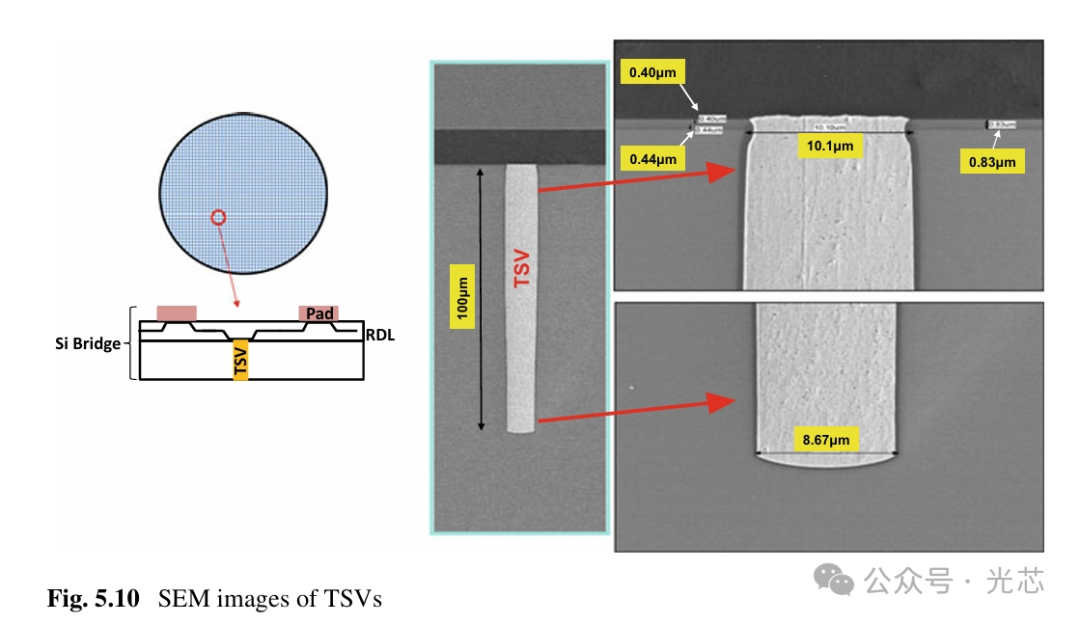 SEM横截面图像如图5.10所示。可以看出,TSV的直径在底部略微减小,这在蚀刻过程中是可以预见的。电镀后在400°C下进行30分钟退火,然后通过CMP(化学-机械抛光)去除表面多余的Cu。