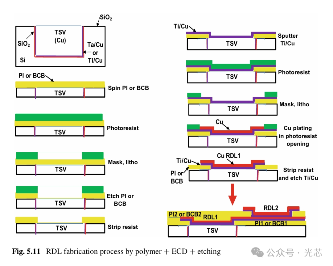 继续用图5.9和5.10中的晶圆加工,通过聚合物制造RDLs的制造过程如图5.11所示。