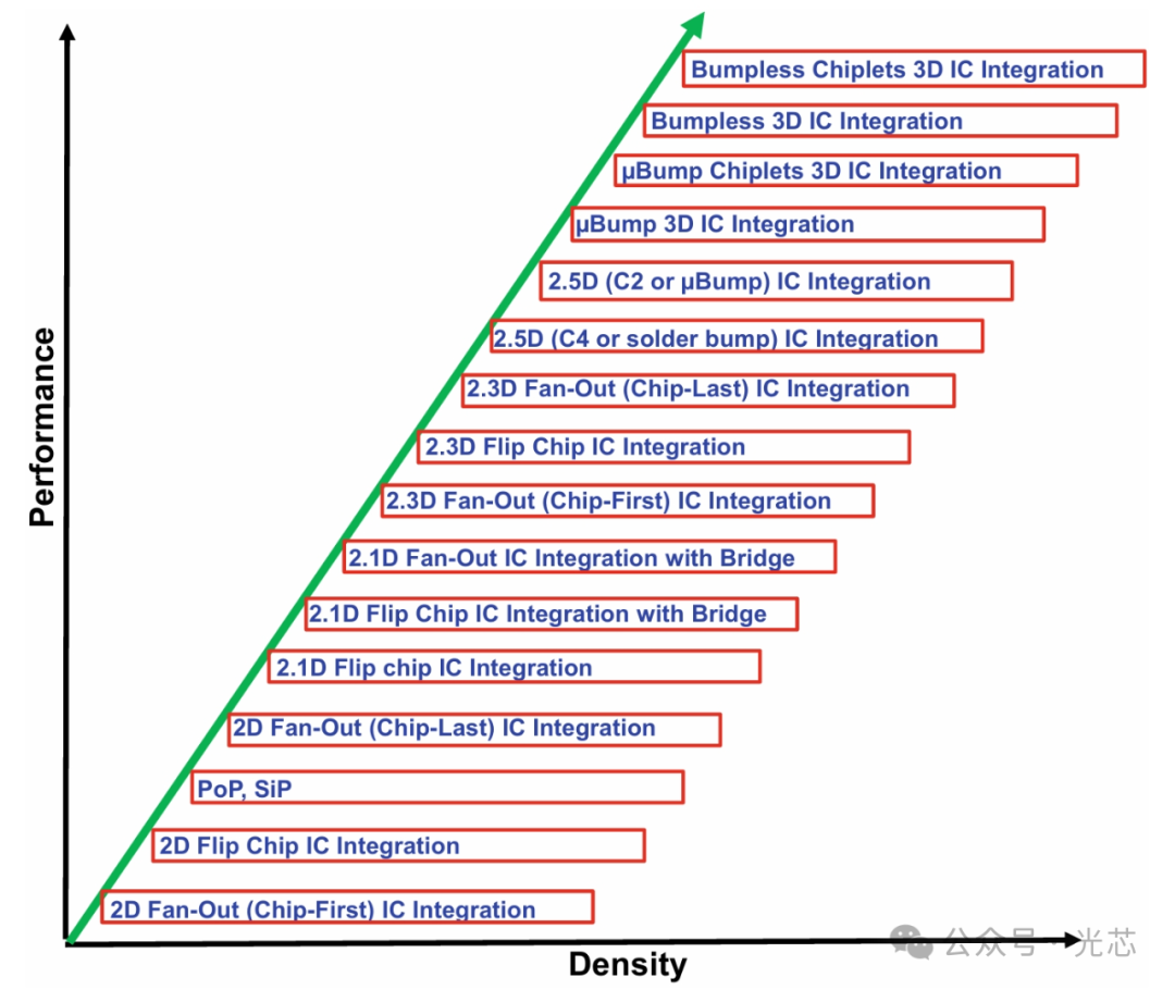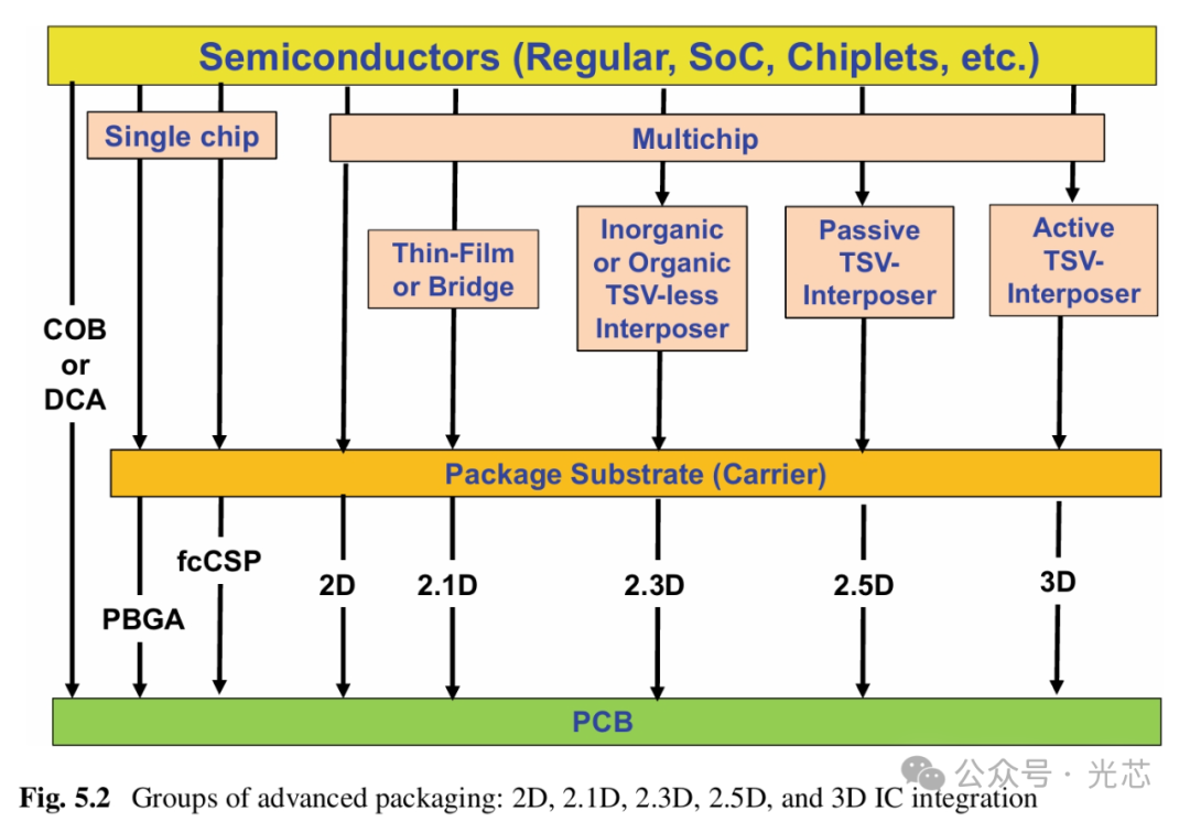 上图5.1展示了各种先进的封装技术以及它们的性能和密度排名。图5.2展示了包括2D、2.1D、2.3D、2.5D和3D IC集成在内的先进封装技术分类。本章的重点在于chiplet和异构集成,尤其是chiplet通信。chiplet和异构集成的主要区别在于,“chiplet”是一种芯片设计方法,而“异构集成”是一种芯片封装方法。