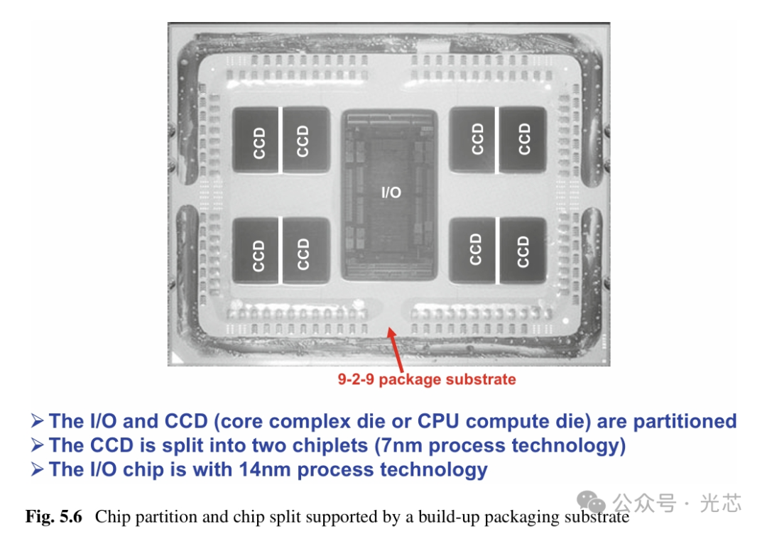 图5.6展示了AMD在2019年中期推出的第二代高性能(EPYC)服务器处理器,7002系列。AMD的解决方案之一是将SoC分割成小芯片chiplet,用最先进的CMOS工艺加工CPU,而将I/O和存储器则用了n-1代的工艺加工。