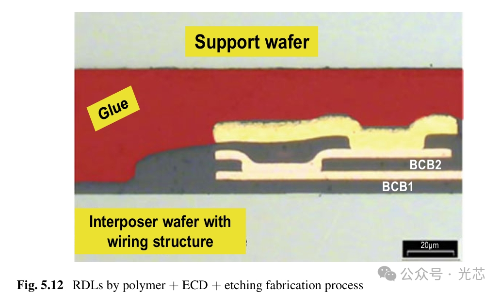 典型的带有聚合物(例如BCB)作为钝化层,Cu电镀作为金属层的RDL如图5.12所示。可以看出,钝化层BCB1和BCB2的厚度约为6-7微米,RDL约为4微米。应注意,光刻可以直接应用于PI或BCB以获得更大的尺寸。在这种情况下,不需要第一组光刻胶。