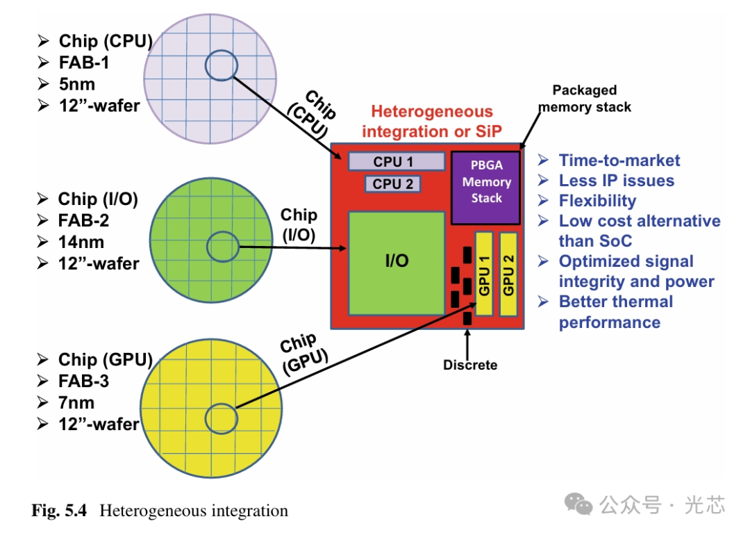 在TSV中介层异构集成的方案中,图5.3e,SoC(例如CPU、逻辑和HBM)由无源(2.5D)或有源(3D)TSV中介层和积层基板封装。这同样是由性能和封装形态因素驱动的,适用于极高密度和高性能应用。这种集成目前已在大规模生产中。