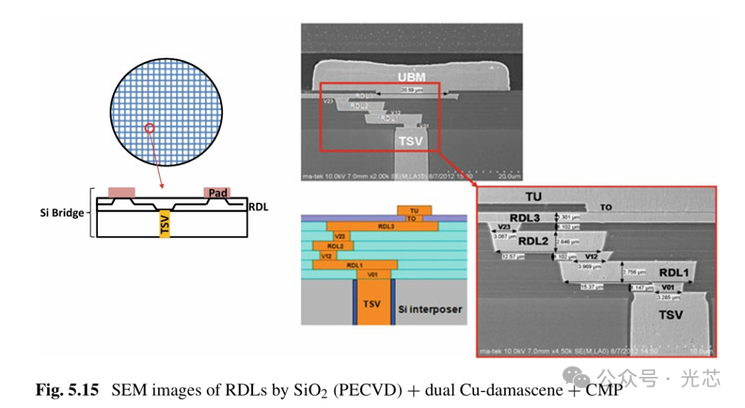 需要注意到,RDLs也可以通过双Cu damascene方法制造,如图5.14所示。使用Cu damascene技术制造的RDL横截面的SEM图像如图5.15所示。最小RDL线宽为3微米。RDL1和RDL2的厚度为2.6微米,RDL3为1.3微米。RDL之间的钝化厚度为1微米。