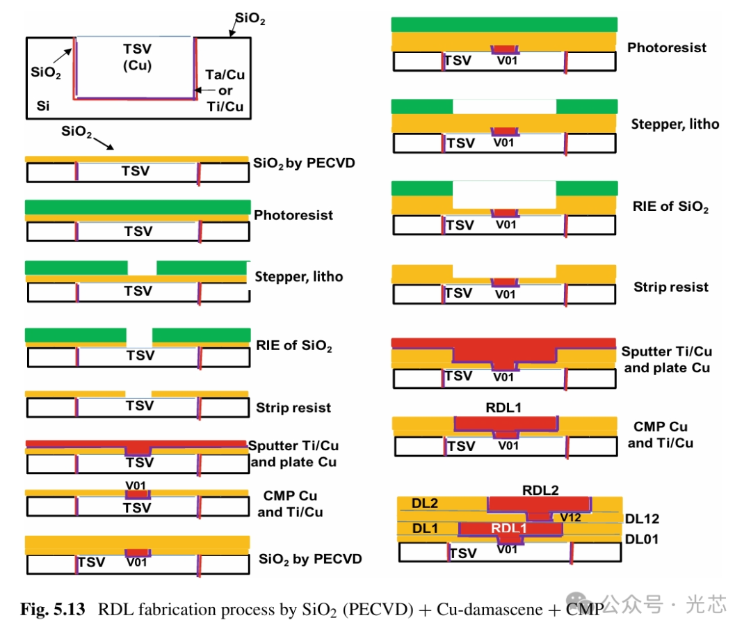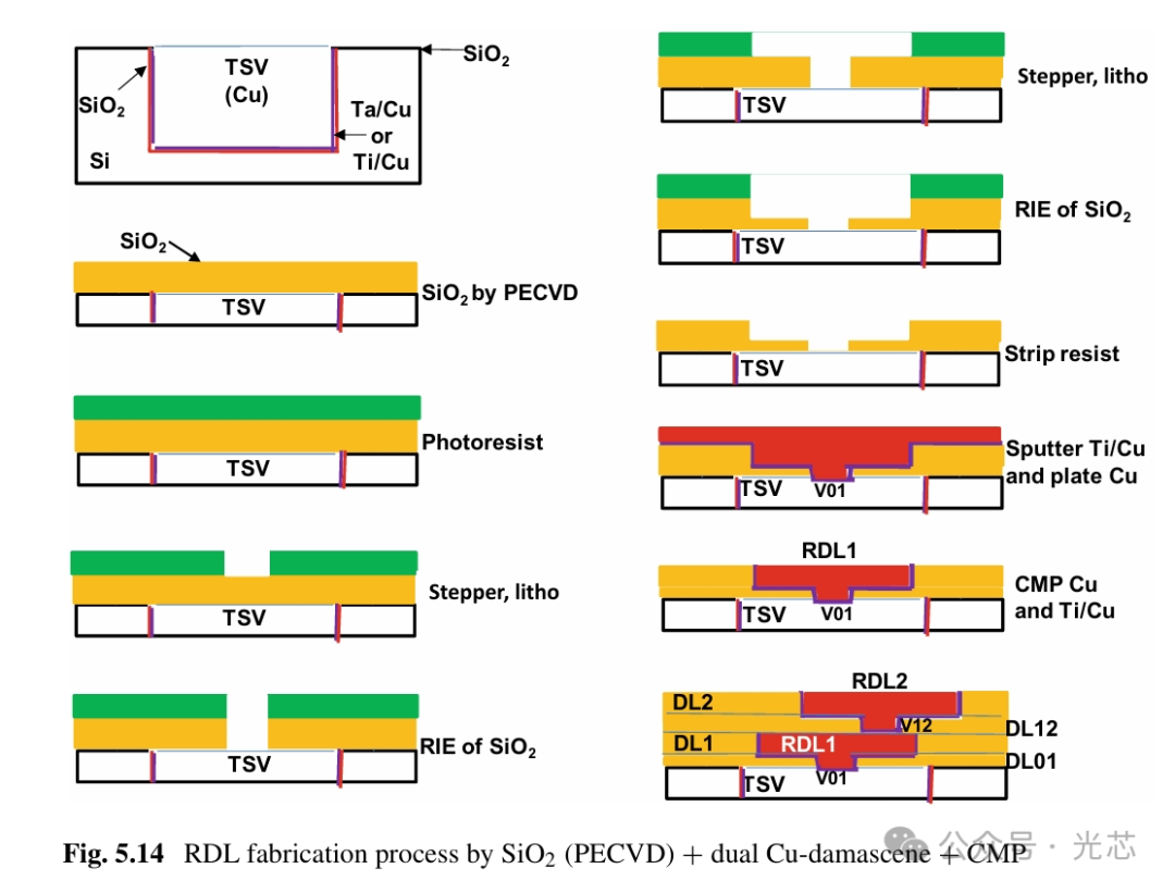 另一种RDL制造方法是Cu damascene工艺。还是从图5.9和5.10中的晶圆开始,使用Cu damascene技术制造RDL的过程主要基于半导体后端线路过程。详细情况如图5.13所示。