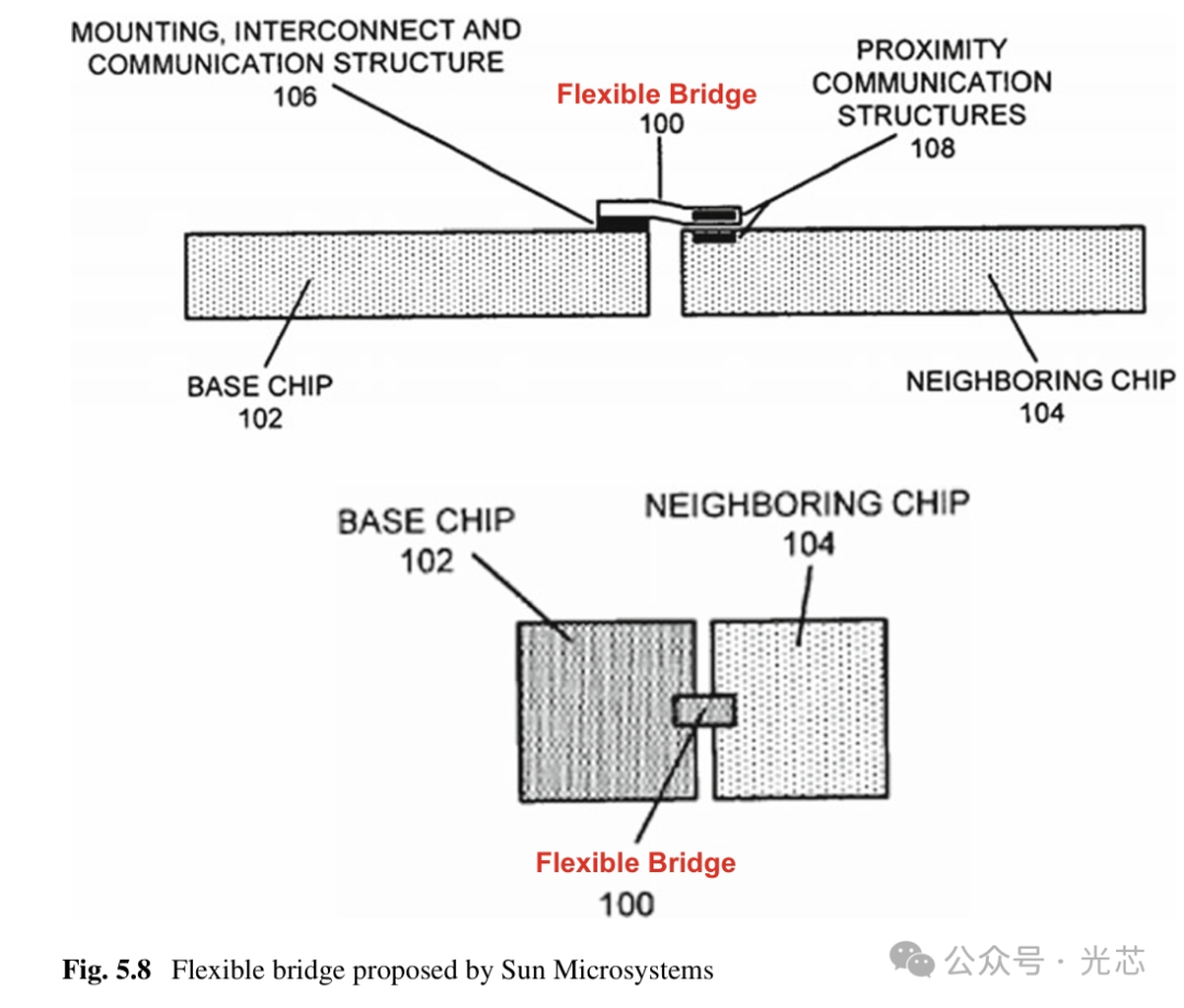 柔性桥其实就是RDL本身,它有精细金属L/S/H导线和介电聚合物如PI组成。第一个柔性桥专利申请US 2006/0095639 A1由SUN Microsystems(后来被甲骨文收购)于2004年11月2日提交(图5.8)。对于高速和高频应用,如毫米波频率,介电层也可以是液晶聚合物(LCP),称为LCP-柔性桥。柔性桥不在本书讨论范围内。