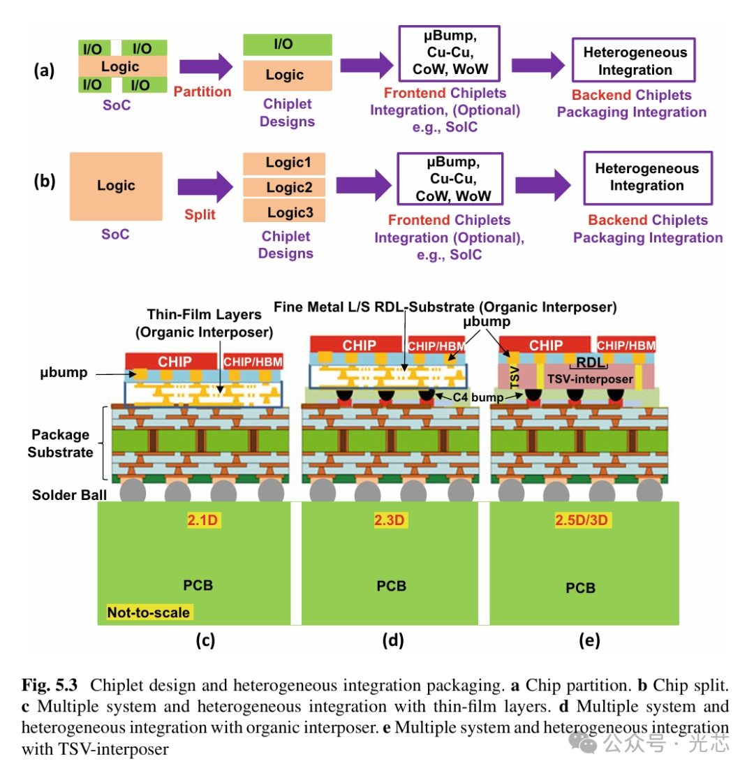(1)芯片分割(chip partition)和异构集成(由成本和技术优化驱动),图5.3a;