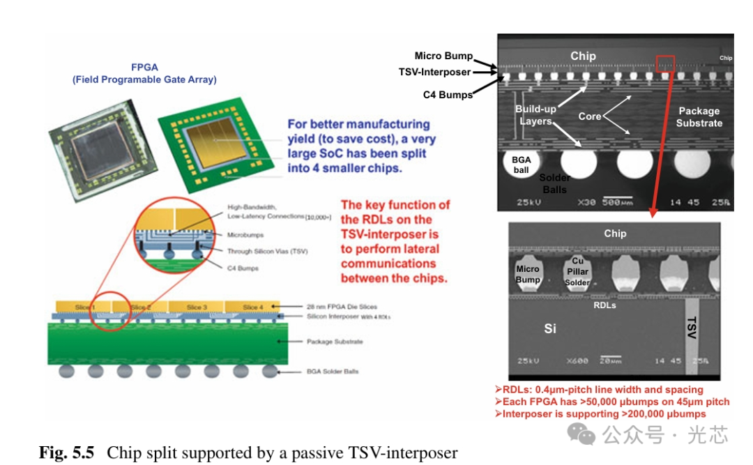 过去,chiplet设计和异构集成封装的通信是通过带精细金属导线的TSV-interposer、积层高密度有机基板和扇出RDL来实现的。图5.5展示了Xilinx在2013年推出的Virtex-7 HT系列。2011年,Xilinx要求TSMC使用28nm工艺技术制造其FPGA SoC芯片。由于芯片尺寸较大,良率非常差。然后,Xilinx重新设计并将大型FPGA分割成四个较小的芯片,如图5.5所示,TSMC以高良率的28nm工艺制造了这些小芯片,并用CoWoS技术进行封装。CoWoS是一种2.5D IC集成,是实现这四个芯片横向通信的关键基板。TSV-interposer上的四个重分布层(RDLs)的最小节距为0.4um。TSV-interposer因其制造良率损失(TSV-interposer的尺寸非常大,即使是64nm工艺)而成本非常高。