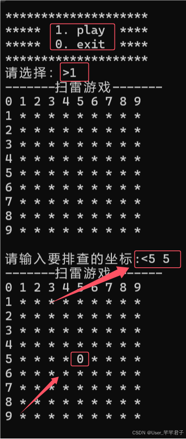 扫雷过程中,布置的雷和排查出的雷的信息都需要存储,所以我们需要一定的数据结构来存储这些信息。 (1)我们需要创建两个二维i数组,一个存放布置好的雷(“1”为雷,“0”为非雷),一个存放排查出的雷的信息这样可以避免产生混淆和打印上的困难; (2)因为我们需要99的棋盘,所以数组要打印成1111的,防止越界