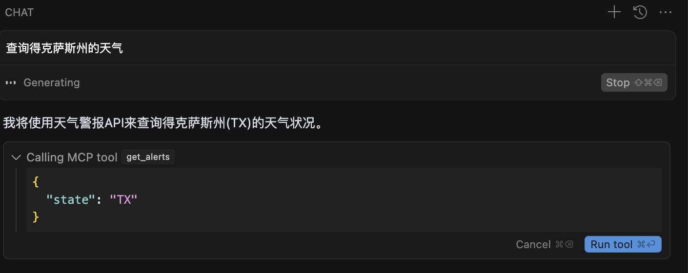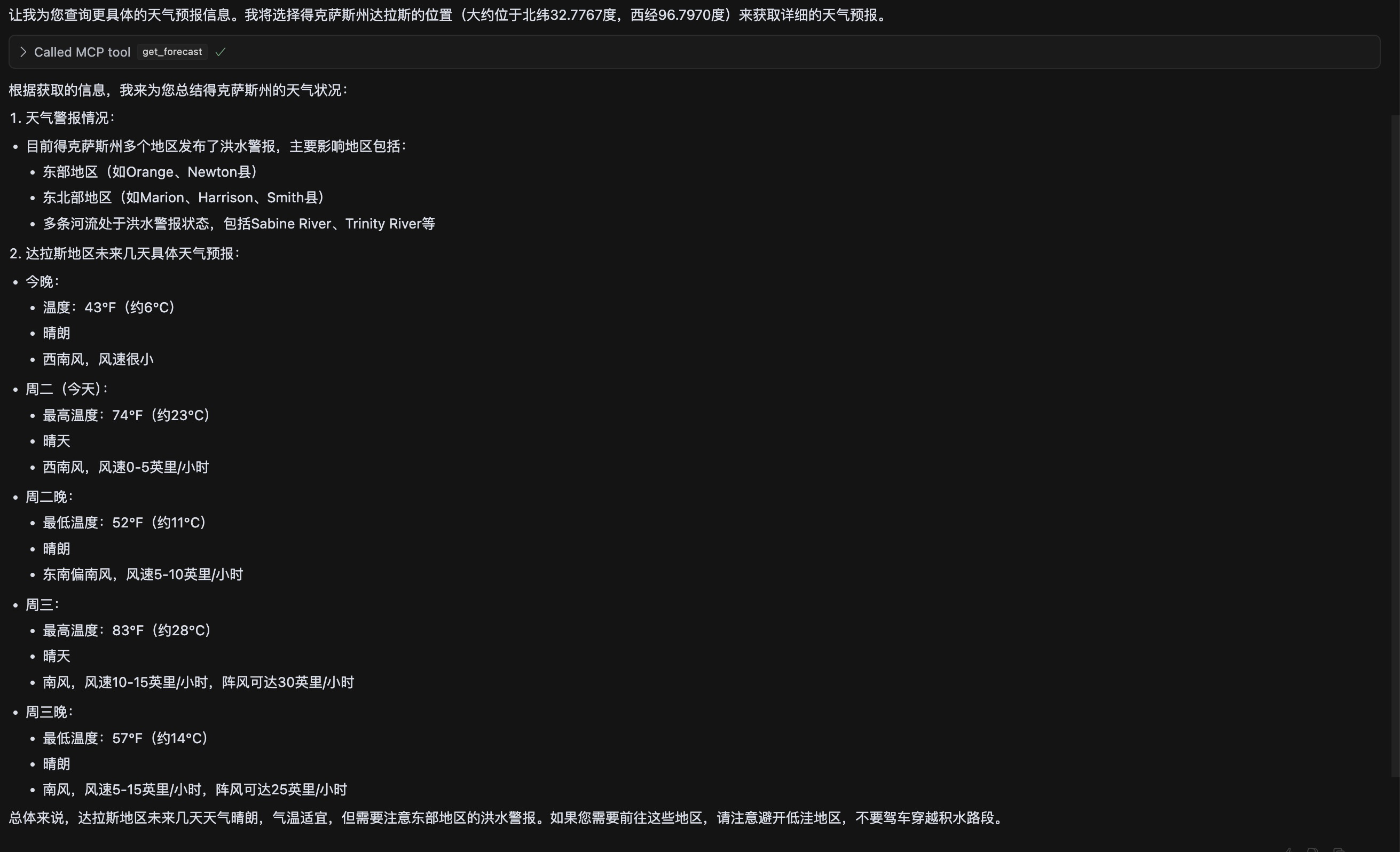 从界面中可以看到 MCP Server 的信息, weather 一共定义了两个 tools:get_alerts 和 get_forecast。