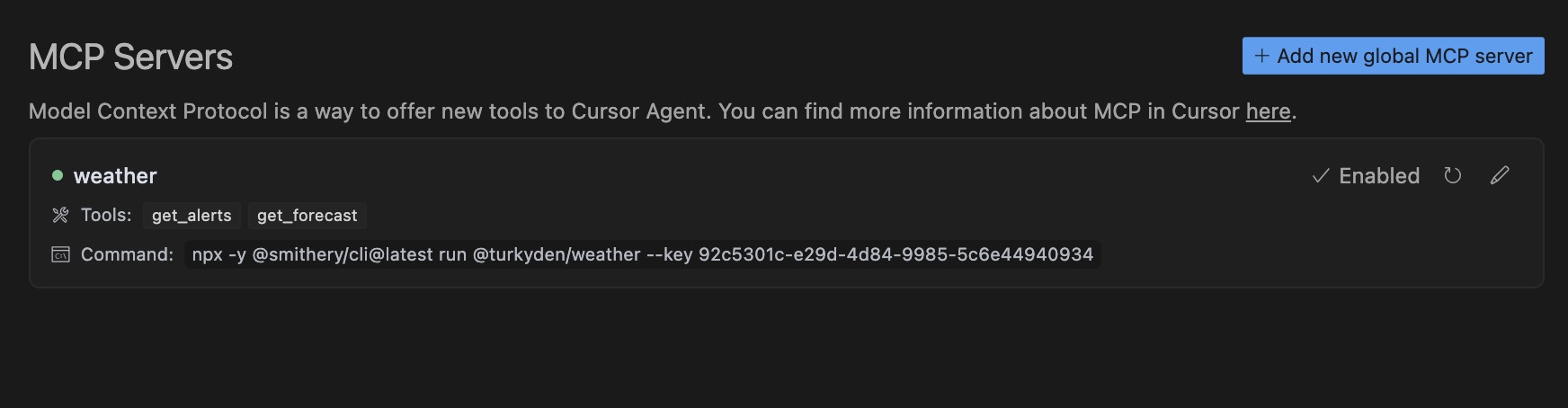 在保存了mcp.json之后,Cursor Settings 中 MCP 配置页面就多了一个名为 weather 的 MCP server。