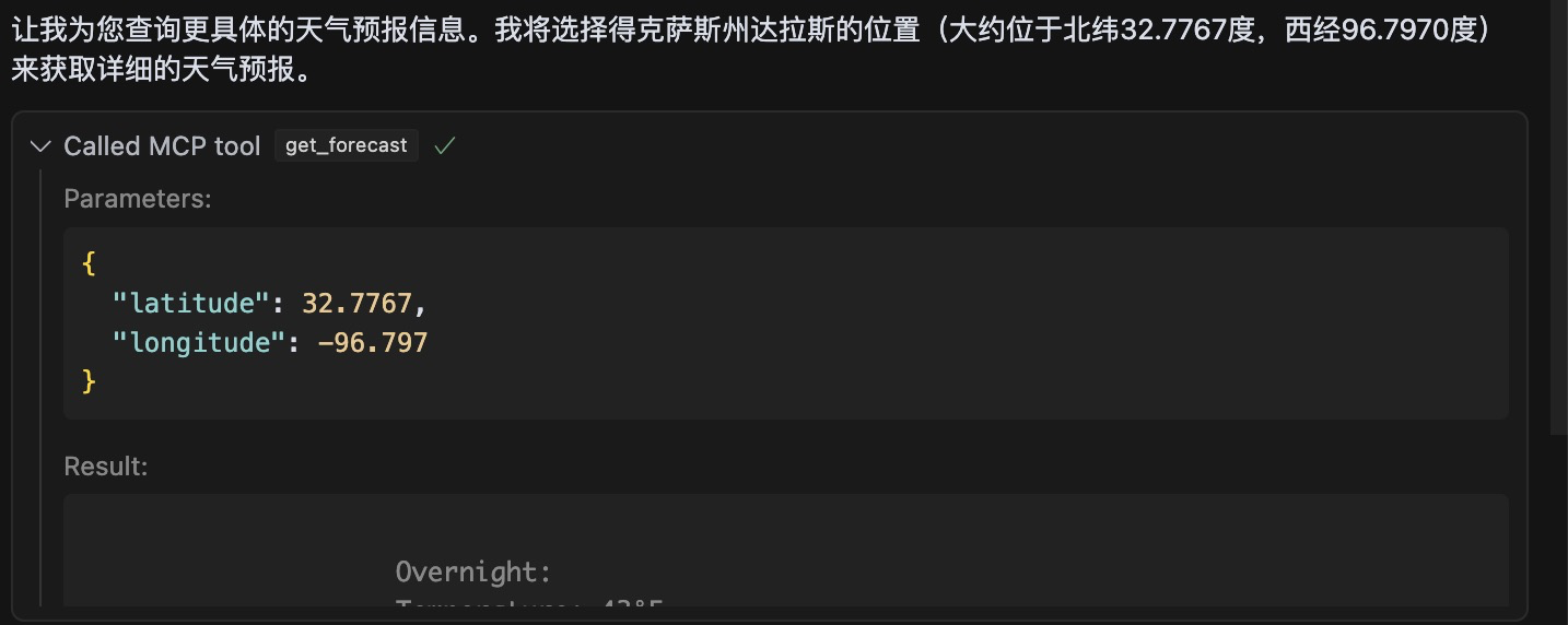 然后 weather 这个 MCP Server就被cursor调用成功,然后返回查询天气的结果。