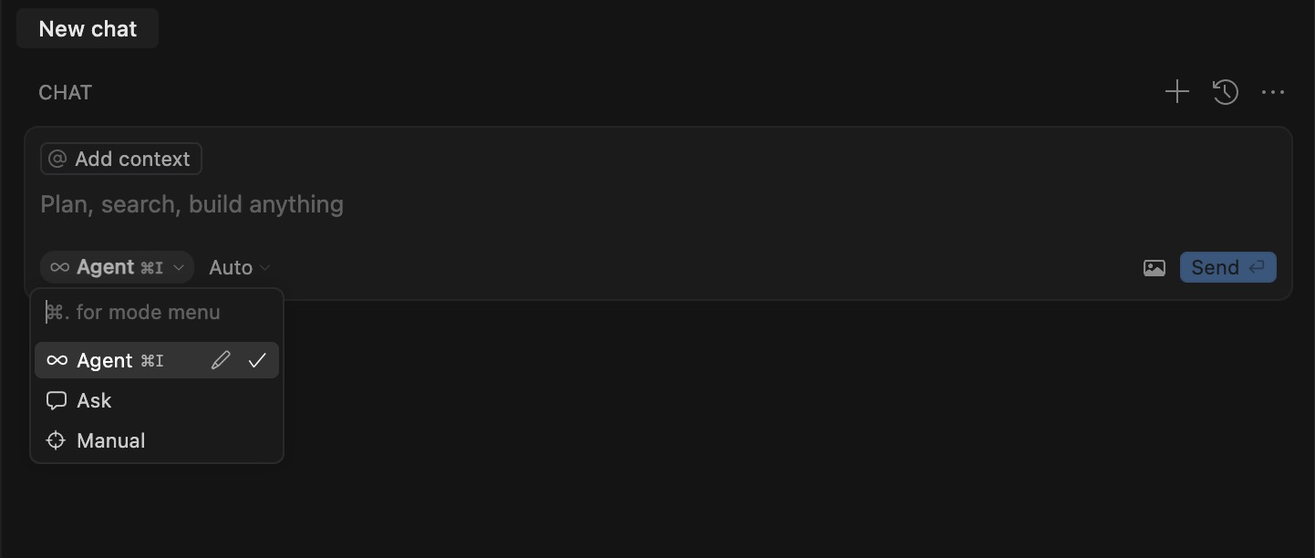配置完成之后,接下来就是在cursor中调用 weather 这个查询天气的 MCP server。在 CHAT 对话框中,选择 Agent 模式。