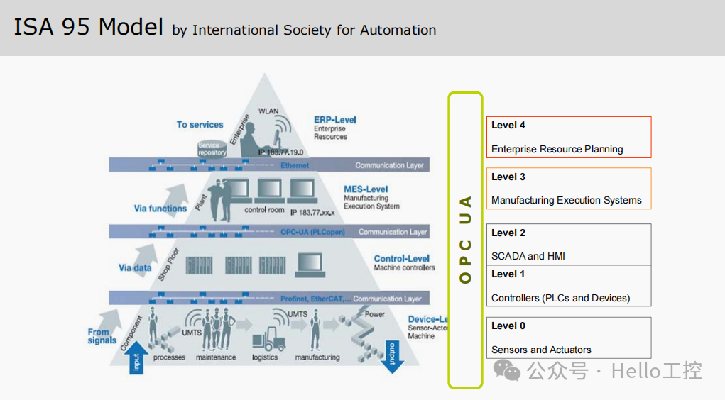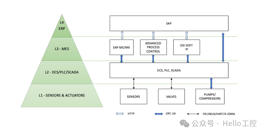 在连续和离散制造行业(如石油和天然气、能源生产、化工厂、汽车制造等)中,OT 与 IT 系统之间的数据交换遵循 ISA/ANSI 95 规定的指南。ISA/ANSI 95 标准化了企业应用程序与工业控制系统之间的自动化接口,并定义了技术与业务流程所适应的四个层级: