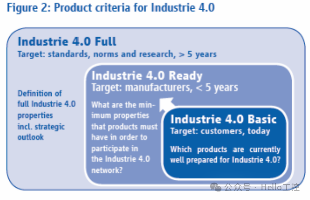 早在 2015 年 4 月,工业 4.0 参考架构模型(RAMI 4.0)就推荐仅使用 IEC 标准 62541 OPC 统一架构(OPC UA)来实现通信层。2016 年 11 月,工业 4.0 平台发布了一份产品分类和宣传为“基础”、“就绪”或“完整”的清单。为了符合“工业 4.0 通信”标准,即使是最低类别,产品也需要通过 TCP/UDP 或 IP 网络地址可访问,并且至少需要集成 OPC UA 信息模型。因此,任何被宣传为“工业 4.0 兼容”的产品都必须具备 OPC UA 功能(要么集成,要么通过网关)。该清单还强调了 OPC UA 的信息建模特性。