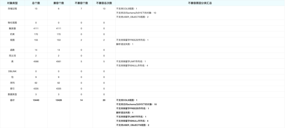 对象评估 | 表、索引、约束、序列、视图、存储过程、函数、触发器、DBLINK、TYPE、同义词、JOB、物化视图。 |