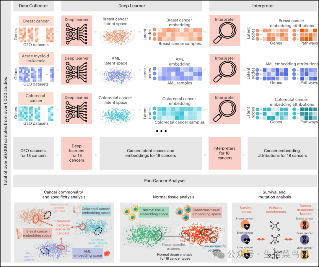 ◉ 我们从常见的微阵列平台下载了18种癌症类型的基因表达数据集,进行了预处理并将其合并成特定于癌症的表达矩阵。总共,我们拥有来自超过1000个GEO数据集的50000多个样本。◉ 我们将表达矩阵传递给深度学习模型以学习特定于癌症的潜在空间。◉ 深度学习模型是VAE(变分自编码器)的集合,它将高维表达信号编码到一个具有生物学意义的‘潜在空间’。◉ 然后我们将训练样本映射到学习到的潜在空间,并定义了癌症样本的‘嵌入’,其中每个深度配置文件潜在变量编码了癌症样本中的某些变异来源。◉ 我们将学习到的嵌入传递给解释器模型,以提取每个潜在变量的‘基因层面和通路层面贡献’。◉ 基因层面贡献表示每个基因对潜在变量的贡献程度。◉ 同样地,通路层面贡献表示与每个潜在变量最重要的基因显著相关的通路。◉ 使用特定于癌症的嵌入和贡献,我们进行了详细的泛癌分析,包括(1)分析18种癌症的潜在空间以发现癌症共同和特异性模式,(2)通过对比癌症嵌入和正常组织嵌入来区分癌症特异性模式和组织特异性模式,以及(3)通过整合深度配置文件嵌入、生存率和肿瘤突变负荷谱来研究生存和突变相关信号(扩展数据图1和2)。◉ 图1的部分内容是使用Servier Medical Art中的图片绘制的。◉ Servier Medical Art由Servier提供,遵循知识共享署名3.0通用许可协议(https://creativecommons.org/licenses/by/3.0/)。◉ (注:部分文字被省略以符合示例格式)