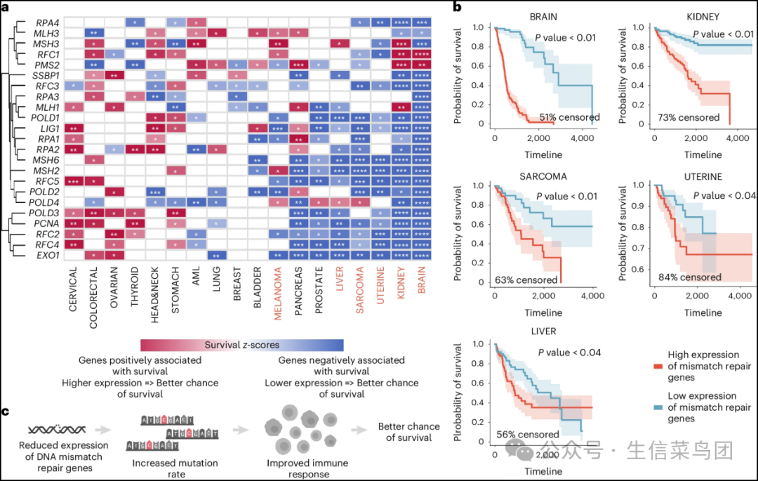 ◉ a, 包含在KEGG错配修复途径中的所有基因的生存z分数热图(z分数的大小>1,z分数的大小>2, z分数的大小>3, ***z分数的大小>4)。通过DeepProfile检测到的六种癌症类型用红色突出显示。◉ b, 错配修复途径平均表达量的Kaplan–Meier图。高于平均值+1个标准差的样本标记为高表达,低于−(平均值+1个标准差)的样本标记为低表达。阴影区域代表置信区间。每种癌症报告了log rank检验P值和被审查样本的百分比。展示了log rank检验P值低于0.05的五种癌症类型。◉ c, 错配修复机制示意图。数据来源