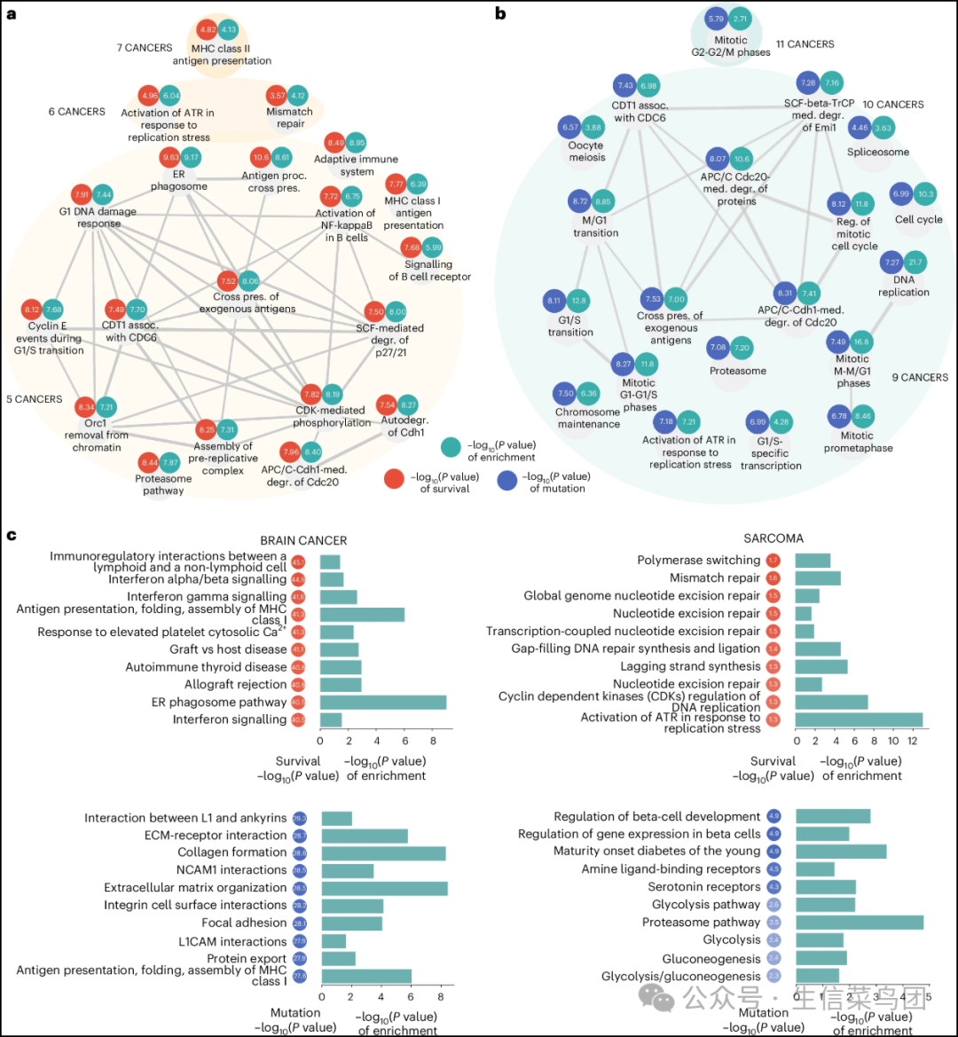 ◉ 网络中的顶级生存相关(a)和TMB相关(b)途径。对于每个途径组,我们展示了该途径显著富集且与生存/TMB显著相关的癌症数量(P < 0.05)。我们进一步展示了跨越所有检测到该途径与生存/突变相关的癌症的平均–log10(P值)富集度和–log10(P值)生存/TMB关联度。◉ 途径之间的连接是基于基因成员Jaccard相似性确定的。◉ c, 大脑癌(左)和肉瘤(右)的顶级生存和突变相关途径图。◉ 顶部:展示的癌症中生存评分最高的前10条途径以及生存和富集的–log10(P值)。◉ 底部:展示的癌症中突变评分最高的前10条途径。◉ 所有途径和癌症类型的评分可在补充数据集9中获得。原始数据