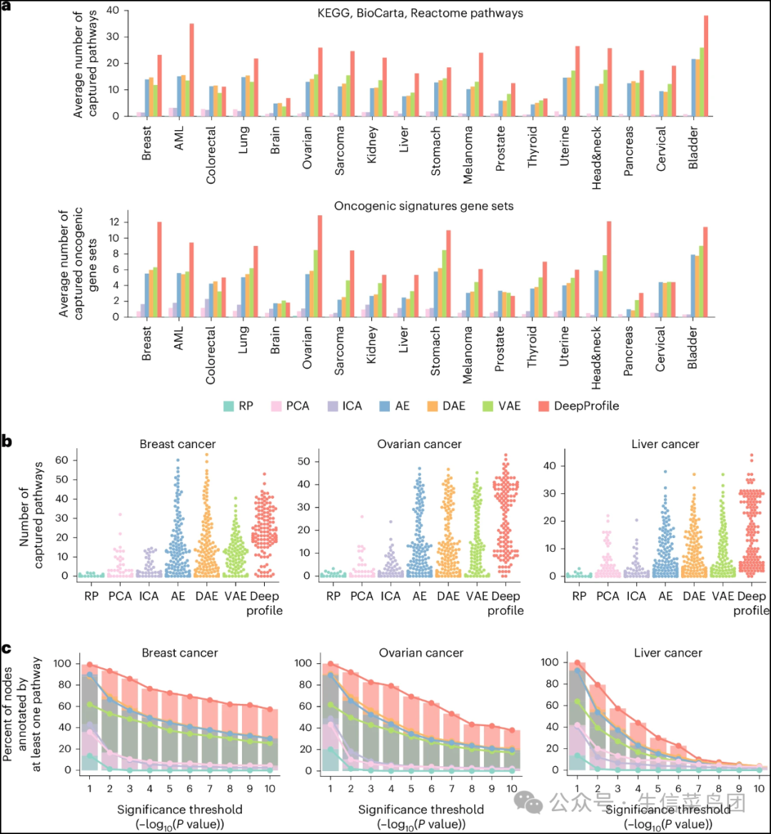 ◉ 平均而言,通过DeepProfile和其他降维方法的潜在嵌入变量显著捕获(FDR校正P < 0.05)的KEGG、BioCarta和Reactome通路数量(顶部),以及Oncogenic Signatures基因集(底部)显示出来。◉ 每个嵌入的每个潜在变量与每条通路关联一个P值,并且我们计算每个潜在变量显著捕获的通路数量。◉ 然后,我们将所有潜在变量的这些通路计数平均,以定义一种方法显著捕获的平均通路数量。◉ b,显示了三种癌症类型中每个潜在变量显著捕获的KEGG、BioCarta和Reactome通路数量分布图(有关所有18种癌症,请参见扩展数据图4)。◉ c,比较至少被一个超过显著性阈值的通路注释的潜在变量百分比。◉ 显示了多种显著性阈值下,DeepProfile和其他替代降维方法的注释潜在变量的百分比。◉ 提供了三种癌症类型的示例(有关所有18种癌症,请参见扩展数据图5)。