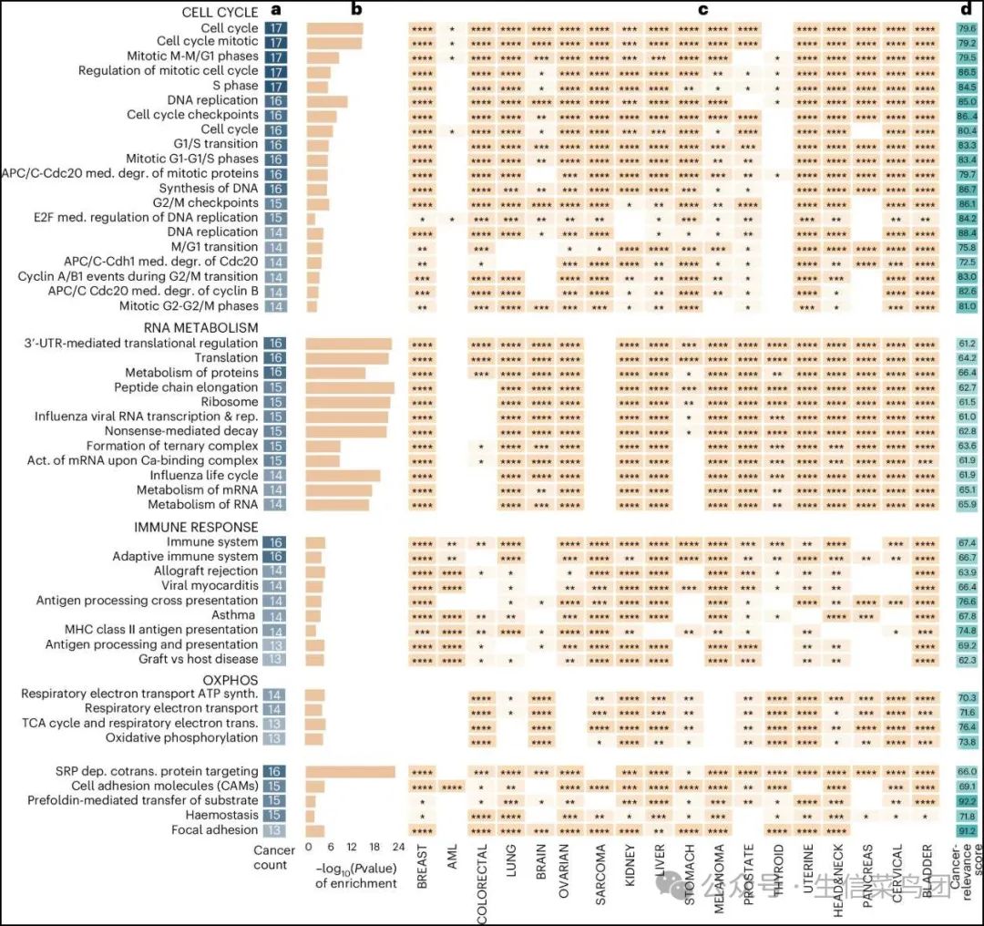 ◉ 这些通路根据显著捕获该通路的癌症类型数量进行排序。所有通路的所有得分可以在补充数据集3中获得。◉ a, 在18种癌症中有多少种显著捕获(FDR校正后的P < 0.05)每条通路。◉ b, 所有显著捕获该通路的癌症的富集P值的-log10平均值。◉ c, 表示顶级通路和所有癌症类型的富集P值显著性的热图。星号注释对应于富集的显著性(*P < 0.05, **P < 0.01, ***P < 0.001, ****P < 0.0001)。◉ d, 通路的癌症特征评分。癌症特征评分表示每条通路与正常或癌变组织的相关性,其中较高的分数表明该通路对于癌变组织特别重要。根据功能关系手动将通路分组。各通路组的顺序由各通路组的平均癌症特征评分决定。◉ 数据来源