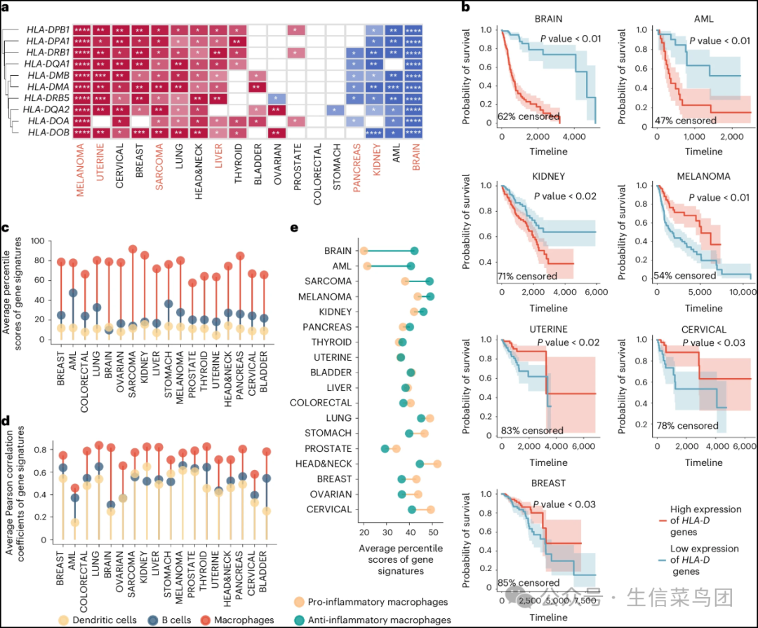◉ a, 包含在Reactome MHC II类抗原呈递通路中的所有HLA-D基因的生存z分数热图。通过DeepProfile检测到的七种癌症类型用红色突出显示。◉ b, 表达水平低于平均值+1个标准差的样本被标记为高表达,低于-(平均值+1个标准差)的样本被标记为低表达。Kaplan–Meier曲线展示了log rank检验P值低于0.05的癌症类型的HLA-D基因的平均表达情况。阴影区域代表置信区间。每个癌症类型的log rank检验P值和被审查样本的百分比都被报告。◉ c, 展示了18种癌症中树突状细胞、B细胞和巨噬细胞的平均百分位得分比较。◉ d, 展示了18种癌症中HLA-D基因表达与三种细胞类型的细胞类型特征之间的平均皮尔逊相关系数比较。◉ e, 展示了18种癌症中促炎和抗炎巨噬细胞的平均百分位得分比较(补充图8)。源数据