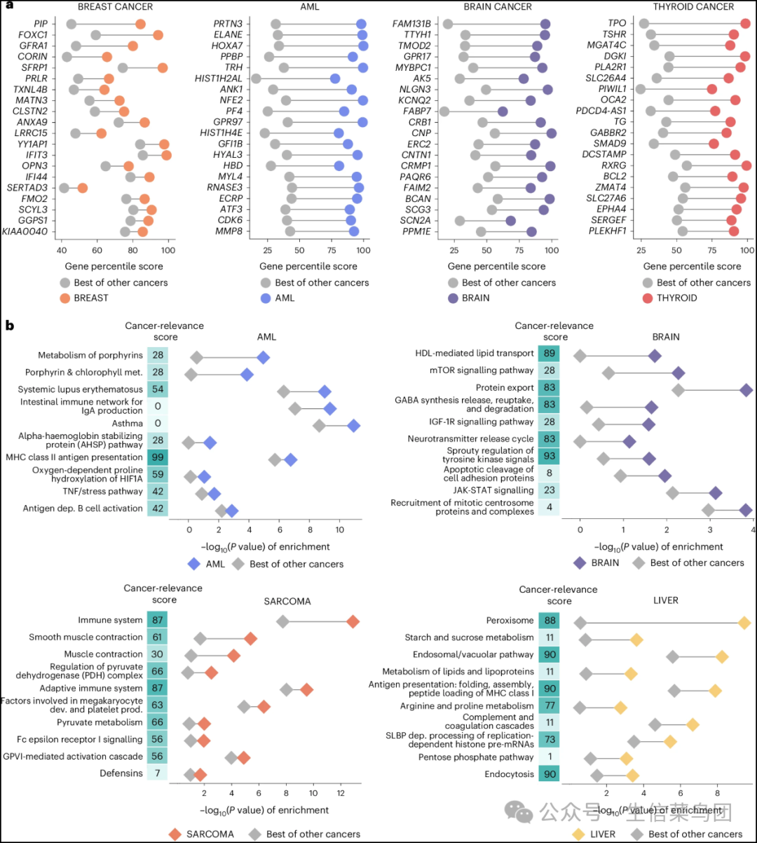 ◉ a, 展示了4种癌症类型的特异性基因图谱。每种癌症类型分别展示了前20个差异得分最高的基因中,该特定癌症类型与其余17种癌症类型中最高百分位分数之间的差异。彩色点显示了一个基因在特定癌症类型中的百分位分数,灰色点显示了该基因在所有其他癌症类型中所具有的最高百分位分数。基因根据差异值排序。所有癌症类型的基因百分位分数可在补充数据集3中获得。◉ b, 展示了4种癌症类型的特异性通路及其癌症特征评分。通路根据特定癌症类型与其余17种癌症类型中−log10(P值)的差异进行排序。每个点对代表一个通路对应于特定癌症类型的−log10(P值)以及该通路在所有其他癌症类型中所具有的最高−log10(P值)。癌症特征评分向量显示了捕获所示通路的潜在变量的癌症特征百分位分数。较高的癌症特征评分表明给定的潜在变量(因此是通路)在癌性组织中特别重要。所有癌症类型的通路富集评分可在补充数据集3中获得。◉ 源数据