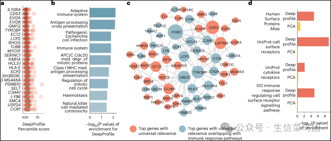 ◉ a, DeepProfile在18种癌症类型中得分最高的基因列表。显示了所有癌症中得分最高基因的百分位分数,并突出了这18种癌症中平均百分位分数。◉ 我们通过计算嵌入所有潜在变量中的基因重要性评分的平均值来计算DeepProfile嵌入中基因的平均重要性,将平均重要性评分转换为百分位分数,并在所有18种癌症中对这些百分位分数求平均。◉ 该图是放大后的,以便清晰比较。◉ 所有基因的通用重要性评分可在补充数据集2中获得。◉ b, DeepProfile中前100个普遍重要的基因的富集通路(KEGG、BioCarta、Reactome)和相应的FDR校正P值。◉ 所有通路的富集评分可在补充数据集2中获得。◉ c, 具有通用重要性的前100个基因网络。该网络由StringDB生成,并排除了不相连的潜在变量。◉ 潜在变量的大小由hubness决定,即边的数量。◉ 参与免疫反应相关通路的基因被标记为蓝色。◉ d, DeepProfile和PCA中前100个普遍重要基因的细胞表面和细胞因子受体的富集P值。◉ 来源数据