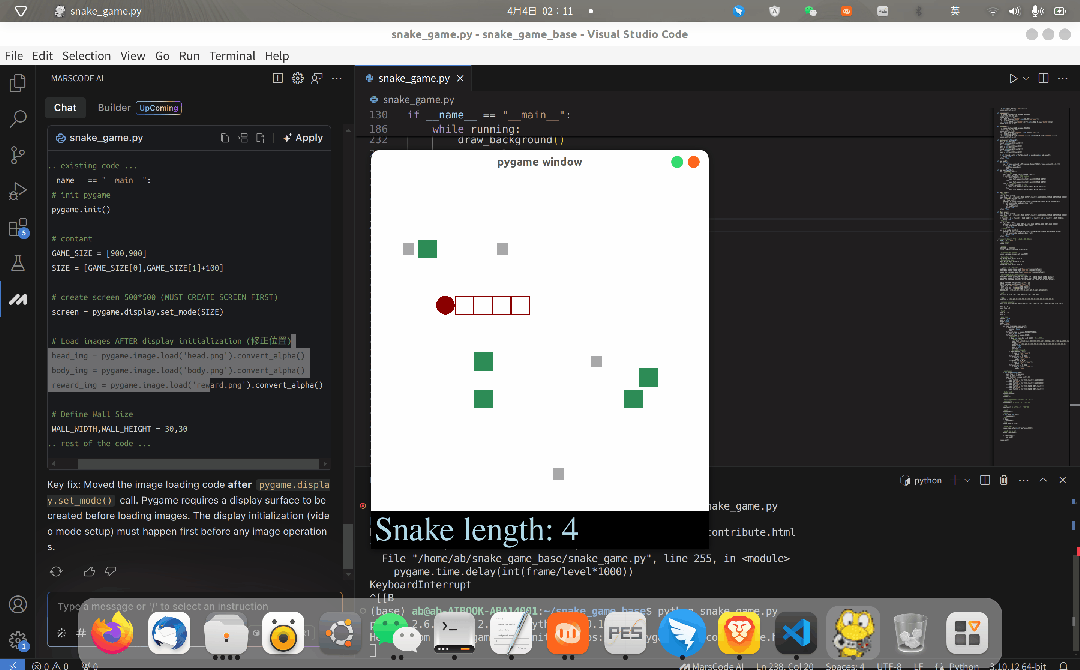 此外,AIBOOK 还能用来“魔改”创意小游戏,比如用 AI 编程助手让经典贪吃蛇游戏换个“玩法”——蛇头变哪吒,蛇身变莲藕,吃的奖励是闪闪发光的灵珠,且整个过程无需手写代码,只需通过自然语言对话。