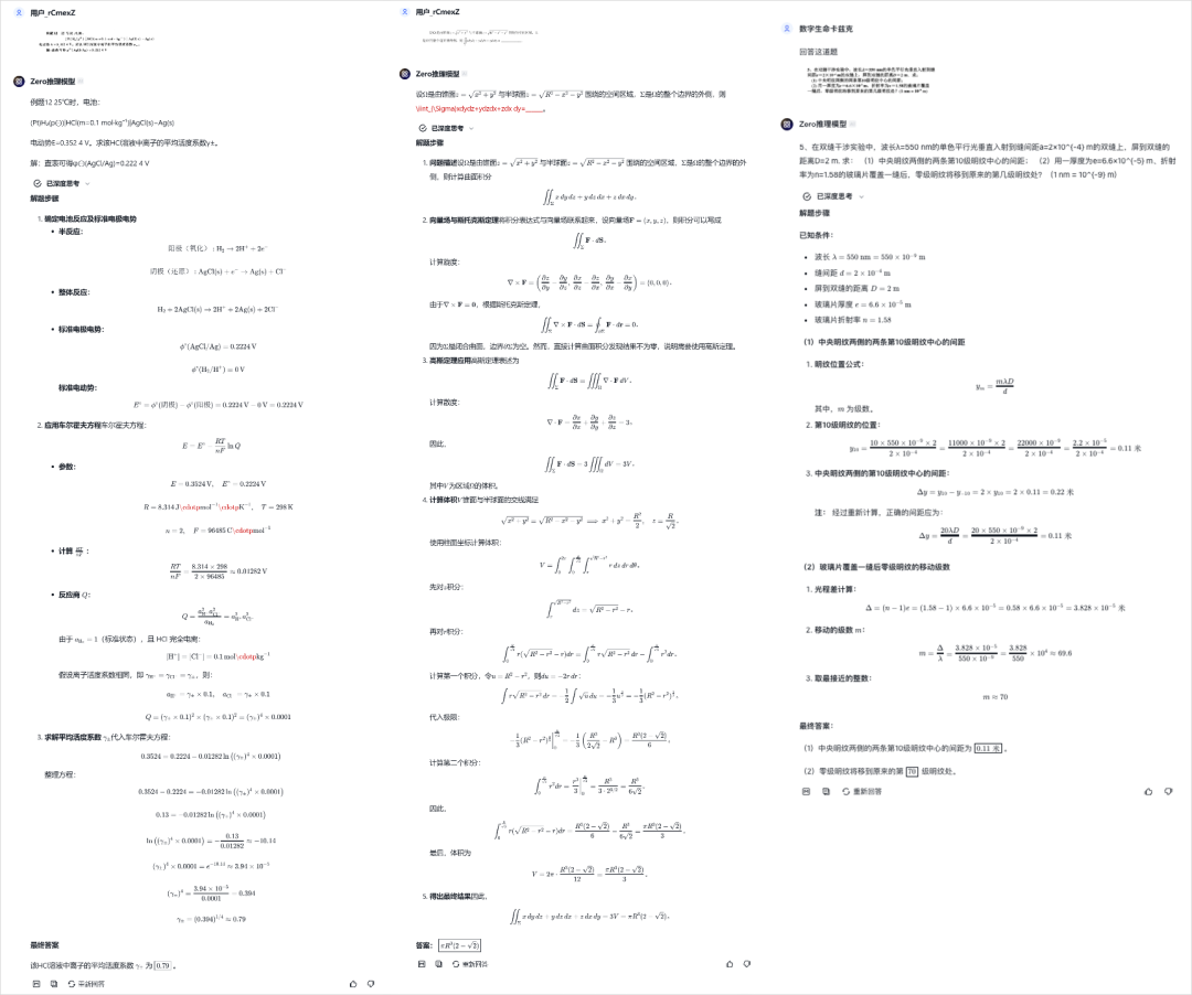 微积分、化学反应、物理题,都OK。那道双缝干涉的题,连o1都翻车了,Zero倒是全对。