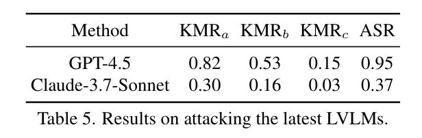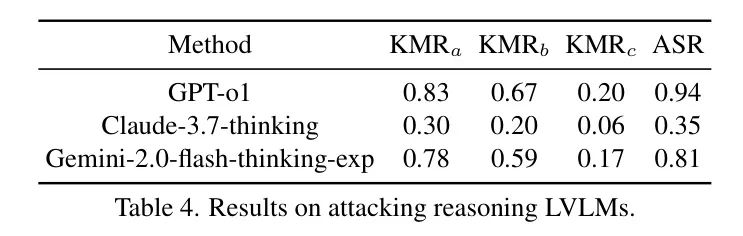 作者还将作者的对抗样本在最新的以推理为中心的商业模型上进行了评估,包括GPT-4.5、GPT-o1、Claude-3.7-sonnet、Claude3.7-thinking和Gemini-2.0-flash-thinking-exp。表4和表5总结了作者的发现。尽管这些模型具有以推理为中心的设计,但在攻击下的鲁棒性却与不进行推理的相应模型相当甚至更弱。这可能是因为推理仅发生在文本模态中,而配对的不进行推理和进行推理的模型共享相似的视觉组件。