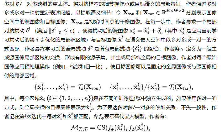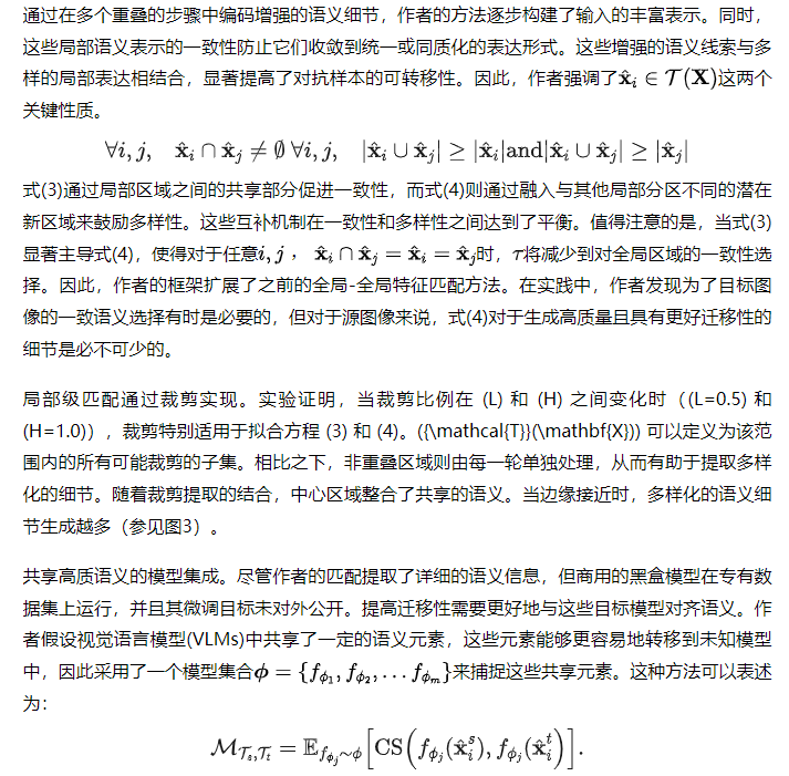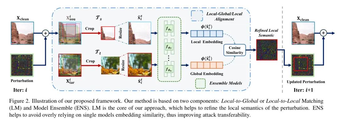 框架概述。作者的方法旨在通过在扰动中提取与目标图像中特定语义匹配的细节来增强语义丰富性。这样,作者可以通过一对一或多对多的配对,提高对抗样本在各种模型中的可移植性,使它们即使面对最 robust 的黑盒系统(如 GPT-4o、Gemini 和 Claude)也能保持有效性。如图2 所示,在第 次迭代中,生成的对抗样本先进行随机裁剪,再调整为原尺寸。然后,通过一组 Agent 白盒模型计算局部源图像嵌入与全局或局部目标图像嵌入之间的余弦相似度,以指导扰动更新。通过这种迭代的局部-全局或局部-局部配对,源图像中的中心扰动区域会逐渐变得更加精细,从而提升语义一致性并增强攻击效果,作者发现这对于商业黑盒大语言模型特别有效。