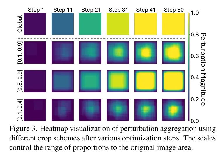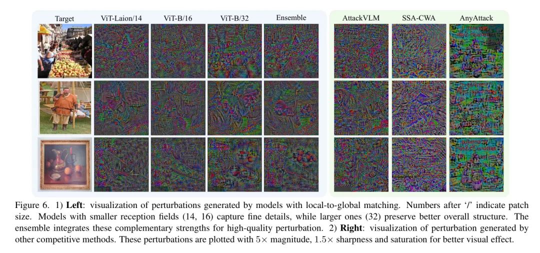 作者的集成体系结构具有双重目的。在较高层次上,它提取共享语义,这些语义能够更有效地转移到目标黑盒模型中。在较低层次上,它可以结合具有互补感知域的模型以增强扰动质量。具有较小感知域的模型(例如,较小切片区大小的 Transformer )可以提取更细腻的扰动细节,而具有较大感知域的模型则更好地保留整体结构和模式。这种互补集成显著提升了最终的扰动质量,如图6所示。