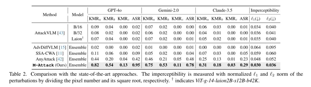 超参数。除非另有说明,作者设置扰动预算为,如表2、4、5在范数下的设置,总优化步数为300步。表2和表3中Claude-3.5的设置为0.75,而在其他地方,包括不可察觉性指标中,设置为1。有关的消融研究详见附录。
