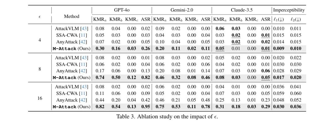 扰动预算 . 表3 显示了扰动预算 对攻击性能的影响。较小的 值提升了不可感知性但降低了攻击的可移植性。作者的方法在大多数 设置下维持了更优的 KMR 和 ASR,同时始终保持最低的 和 范数。总体而言,在不同的扰动约束条件下,作者的方法均优于其他方法。