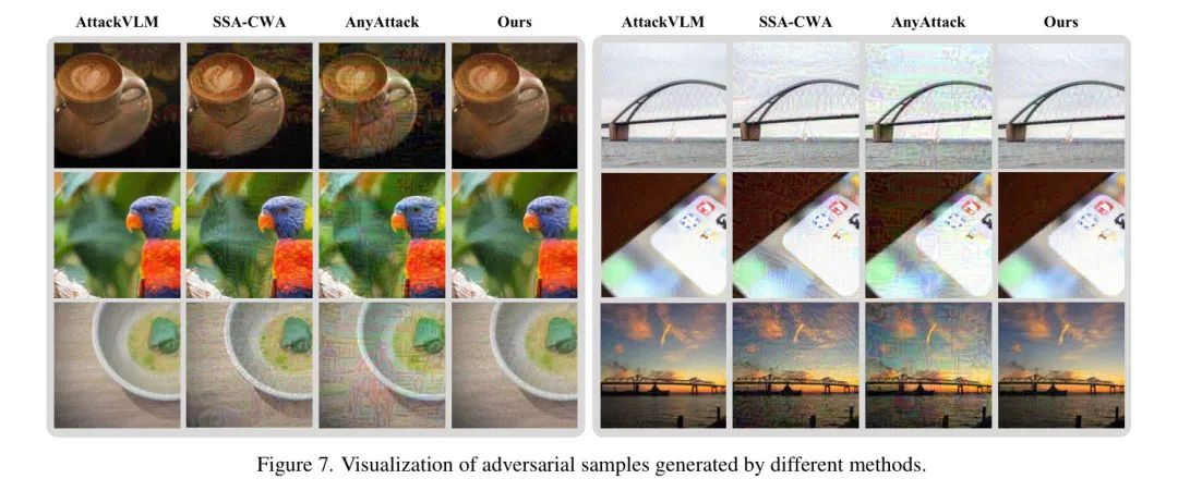 图7展示了作者方法在不可感知性和语义保存方面的优越性。AttackVLM在扰动中几乎没有保留语义信息,因此在大多数情况下都无法成功。尽管语义对于实现成功的迁移很重要,但SSA-CWA和AnyAttack生成的对抗样本仅表现出一些粗糙的形状而缺乏精细的细节,导致扰动呈现出僵硬的效果,与原始图像对比明显。此外,AnyAttack生成的对抗样本还表现出模板化的干扰模式,容易被察觉。相比之下,作者的方法专注于优化微妙的局部扰动,不仅提高了迁移性,还在全局对齐的基础上提升了不可感知性。