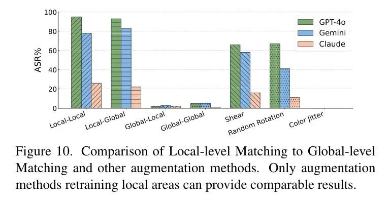 局部级匹配。作者评估了四种匹配策略:局部-全局、局部-局部(作者的方法)、全局-局部(仅裁剪目标图像)和全局-全局(不进行裁剪)。图10展示了作者的结果:在Claude上,局部-局部匹配略优于局部-全局匹配,但差距并不显著。全局级匹配对大多数攻击失效,强调了等式(4)在源图像中的重要性。此外,作者在图10中测试了传统的数据增强方法,包括剪切、随机旋转和色差,与作者的局部级匹配方法进行对比。包含在等式(4)中定义的局部裁剪的变换,如旋转和平移,取得了不错的成绩,而色差和未保留源图像局部区域的全局级匹配则导致了显著更低的成功率。作者的系统性消融实验表明,局部级匹配是关键因素。尽管这种对齐可以通过不同的操作实现,例如裁剪或平移图像,但它们本质上超越了传统的数据增强方法,突显了保留局部信息的重要性。
