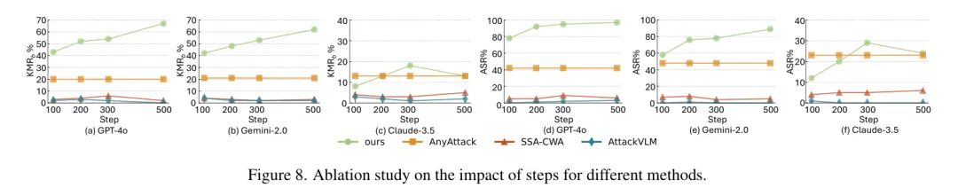 计算预算步骤。图8展示了在优化步限范围内不同性能表现。即使迭代次数减少到100次,作者的方法仍然优于SSA-CWA和AttackVLM Baseline 。与其它方法相比,作者的方法表现更优异。