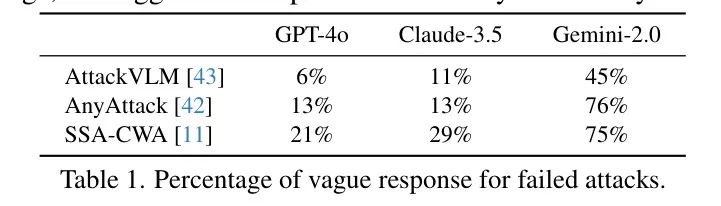 作者的分析揭示了传统对抗策略的一个关键不足在于扰动中缺乏清晰的语义信息。没有有意义的语义线索,这些修改无法有效地影响模型的决策过程。这一观察尤其适用于那些已经优化以从局部和全局图像表示中提取和利用语义细节的商业大语言模型。因此,传统扰动的一致性性质成为了实现高攻击成功率的重大障碍。