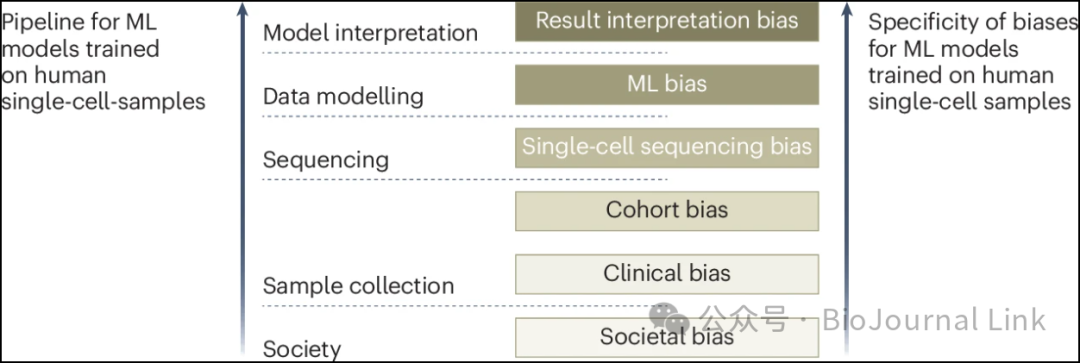 Fig. 2: Illustration of societal, clinical, cohort, single-cell sequencing, ML and result-interpretation biases relevant in ML models of human single-cell data.